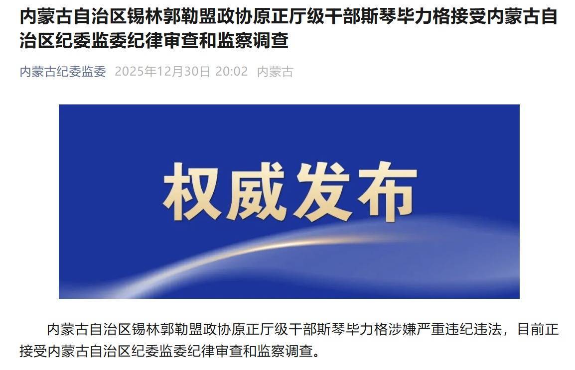 内蒙古自治区锡林郭勒盟政协原正厅级干部斯琴毕力格涉嫌严重违纪违法,目前正接受内蒙古自治区纪委监委纪律审查和监察调查。
